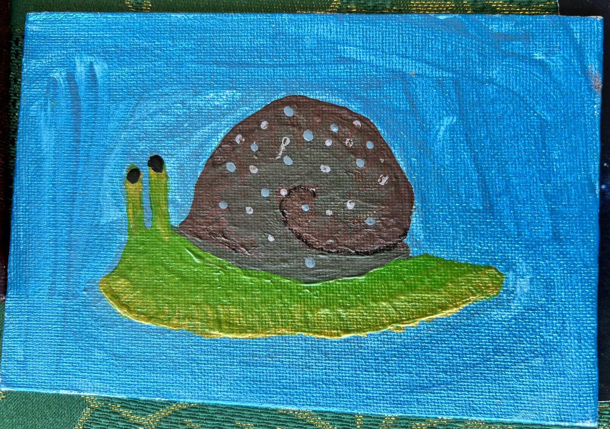 The Little Snail boasts a unique blend of a green body, brown shell, and blue background, adding a touch of color to any environment. With its vibrant appearance, this snail is sure to catch your eye and bring a sense of serenity to your space. Experience the beauty of nature with the Little Snail.